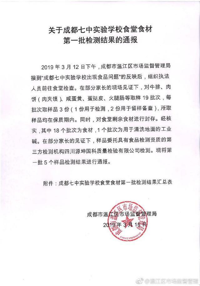 據(jù)通報,2019年3月12日下午,成都市溫江區(qū)市場監(jiān)督管理局接到“成都七中實驗學校出現(xiàn)食品問題”的反映后,組織執(zhí)法人員前往食堂檢查。在部分家長的現(xiàn)場見證下,對牛排、肉餅(肉夾饃)、咸蛋黃、蛋撻皮、火腿腸等取樣19批次,每批次取樣品3份(1份用于檢測,2份用于留樣備查),所取樣品均在保質(zhì)期內(nèi)。同時,對食堂剩余食材進行封存。經(jīng)核實,其中18個批次為食材,1個批次為用于清洗地面的工業(yè)堿。在部分家長的見證下,樣品委托具有食品檢測資質(zhì)的第三方檢測機構四川源坤國科質(zhì)量檢驗有限公司檢測?,F(xiàn)將第一批5個樣品檢測結(jié)果進行通報。