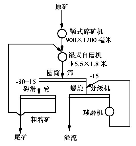 生產(chǎn)初期采用兩毆全閉路半自磨流程醫(yī)圖1(a)。原礦粗碎至350~0毫米,給入濕式自磨機磨碎,自磨機與高堰式螺旋分級機由泥勺機提升組成閉路。自磨機排礦經(jīng)圓筒篩過篩后,+10毫米物料返回自磨機,篩下物料進螺旋分級機分級,返砂也返回自磨機,分級溢流細度為50%~200目左右。分級溢流經(jīng)一段磁力脫水槽脫泥、脫水,并廢棄部分尾礦后,進入第二段磨礦。第二段磨礦為溢流型球磨機與螺旋分級機組成的預檢分級磨礦回路,分級溢流細度為80%~200目,合格溢流進磁選選別。兩段閉路自磨流程的主要問題是,兩段磨礦的負荷不平衡,往往第一段負荷高,第二段負荷不足,而且難以調(diào)節(jié);同時,自磨機中易形成難磨粒級的聚集,致使自磨機的產(chǎn)量提不高,若加大給礦量,則自磨機造成“脹肚”。針對上述存在問題,將原流程改為兩段一開路,如圖1(b)。第一段自磨機開路工作,圓筒篩篩孔改為5毫米,取消了螺旋分級機,篩上產(chǎn)物不再返回自磨機,而給入第二段球磨機磨碎,篩下產(chǎn)物直接進磁力脫水槽和第二磨礦段。自磨機開路工作后提高了處理能力,第二段磨礦的負荷也得到提高,兩段磨礦的負荷趨于平衡。例:某鐵礦兩段半閉路半自磨流程。如圖2所示。