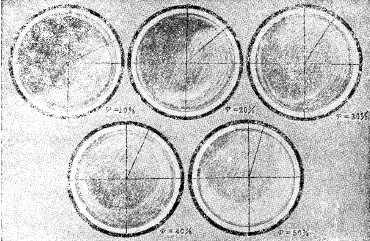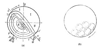 如果磨機的轉速不高,全部球荷向上偏轉一定角度,其中每個鋼球都繞自己的軸線轉動。當球荷的傾斜角超過鋼球在球荷表面上的自然休止角時,鋼球即沿此斜坡滾下。鋼球的這種運動狀態,叫做瀉落,如圖3-1-2中的(a)。在瀉落式工作的磨機中,礦料在鋼球間受到磨剝作用。如果磨機的轉速足夠高,鋼球自轉著隨筒體內壁作圓曲線運動上升至一定高度,然后紛紛作拋物線下落。鋼球落下的地方,叫底腳區,其中的鋼球強烈地翻滾。這種運動狀況,如圖3-2-1中的(b),叫做拋落。在拋落式工作的磨機中,礦料在圓曲線運動區受到鋼球的磨剝作用,在底腳區受到落下的鋼球的沖擊和強烈翻滾著的鋼球的磨剝。倘若磨機的轉速高到超過某一臨界值,鋼球就貼在襯板上不再落下。這種狀態叫離心運轉,知圖3-2-1中的(c)。發生離心運轉時,礦料也是貼著襯板的。以上這些情形,都是指磨機內裝有一定數量的鋼球說的。要是磨機內只有少量的球,它們只是在磨機內較低點擺動,并不發生上面講的三種情況。用拍攝磨機內的介質的運動狀態來研究它的運動規律,本世紀的二十年代已經開始,豪爾太恩、戴維斯、列文遜和我國的王仁東,都先后做過這方面的工作。鋼球作瀉落式運動的力學尚缺乏研究,以后只講拋落式的。再詳細地看看下面幾張關于拋落式和離心運轉的照片。