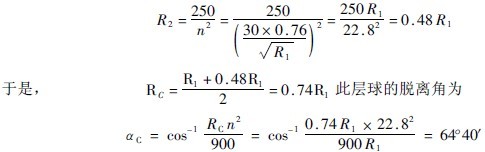 時R 的水平投影XB為極小值。由引可見,對目前所論述的問題說,這兩個極限值只有意義,它是與最小球層半徑R最小相對應的最大脫離角a最大。于是,判斷球層保持明顯的圓運動和拋物線運動的極限狀態的兩個相關連的指標是