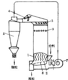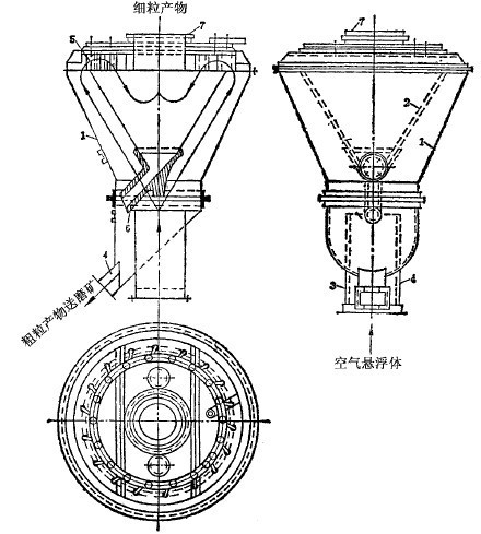圖2所示的上升氣流風力分級機(附旋風集塵器),呈方形的分級室內,裝有若干近于平行的豎直“之”字形導板1。從料斗給到篩板2上的物料,在下部供入的上升氣流作用下,被帶到分級室中,經過彎曲的導板上行過程中,粗的礦粒落下與未過篩的粗粒一起排出,為粗粒產物。細的礦粒經上部通道入旋風集塵器分離,得細粒產物。集塵器上部排出的氣流,又回到風機,循環使用,或者從孔6中排走。