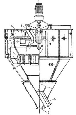 通過式離心分級器(見圖3),主要用于與干式磨機閉路工作。設備主要由外錐1和內錐2組成,上部裝有導向葉片5,使由內外錐之間上來的氣流呈切線進入內錐。磨機產物與氣流一起從底部管道中以大約18~20米/秒的速度向上供入,進入內外錐之間的環形空間后,因過流斷面變大,速度降至4~6米/秒,于是,粗的礦粒落下,由管4中排出,返回磨機再磨。其他礦粒被氣流帶著往上行,經葉片5,呈切線進入內錐,產生回旋運動。在慣性離心力作用下,較粗的礦粒被拋到內錐壁上,然后下落,由排礦管6排出。這種產物或作為產品,或者返回磨機,視情況而定。細礦粒隨氣流從頂部管道中排出,至集塵器中收集,為細粒產物。