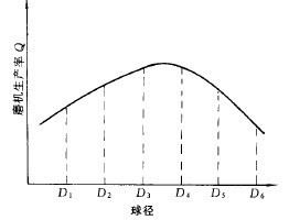 實驗室磨機的規格小,相應的給礦粒度也小,試驗結果可作為中細磨機的球徑選擇依據。因為給礦粒度小,通常3~5mm以下,給礦粒度范圍窄,因此采用單種球徑球組進行試驗即可。選擇的球組不應低于3組,較好的是5或6組,目的是要將待求更好的球徑包括在內,不漏掉較佳值。當其它參數固定不變時磨機指定級別在生產率與球徑之間的關系是一個單峰函數,如圖3-5-2所示。如果選擇D1、D2、D3三種球,生產率曲線到D3時呈上升趨勢,無法判定D3,是較好的球徑值;同樣,選擇D4、D5、D6三種球時,也無法判定D4是較好的球徑值,只有使生產率曲線達到峰值和導數轉向時才能找出更好的值。