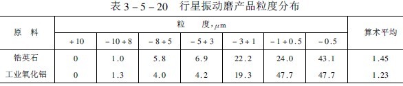 的轉動形成了筒繞Ⅰ號軸的公轉;Ⅱ號輪帶動Ⅵ號輪形成磨筒繞其自身軸的自轉。這種磨機兼有行星磨和振動磨二者的特點,具有高頻沖擊和磨剝的雙重作用,故磨碎作用強,是一種有效的超細磨碎設備。表3-5-20示出了用該磨機磨碎鋯英石和工業氧化鋁的產品粒度分布。