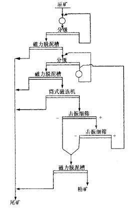 目前,我國(guó)有一些選礦廠(chǎng)應(yīng)用強(qiáng)磁場(chǎng)磁選機(jī)直接選別赤鐵礦或假像赤鐵礦,實(shí)踐證明,這是一種較好的有效方法。例如某選礦廠(chǎng)處理含磁鐵礦和赤鐵礦的礦石,應(yīng)用弱磁場(chǎng)磁選機(jī)和強(qiáng)磁場(chǎng)磁選機(jī)分別回收磁鐵礦和赤鐵礦。其工業(yè)試驗(yàn)流程如圖1所示。采用該流程達(dá)到的指標(biāo)是:原礦品位34.20%(FeO3.7%)時(shí),精礦品位達(dá)56.46%Fe,回收率78.95%。