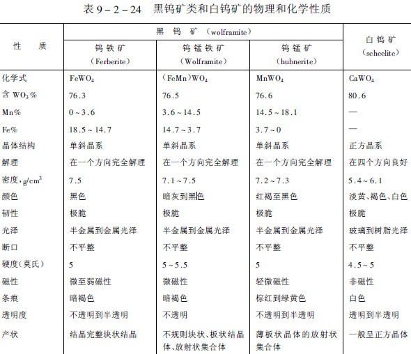 白鎢礦(CaWO sub 4 /sub )是鈣鎢酸鹽,結(jié)晶呈正方晶系,鉬可能取代白鎢礦中的鎢,而形成一種類(lèi)質(zhì)同象的鉬酸鈣(CaMoO sub 4 /sub )礦。白鎢礦在紫外線(xiàn)輻射感應(yīng)下,發(fā)出鮮明的藍(lán)白色熒光,當(dāng)?shù)V物中有鉬存在時(shí),會(huì)改變熒光的顏色,隨著鉬的含量增加,逐漸由藍(lán)色變?yōu)槊咨S色或橙色。表9-2-24是黑鎢礦類(lèi)和白鎢礦的物理和化學(xué)性質(zhì)。