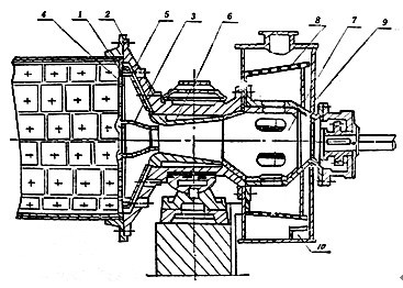 3、邊緣傳動(dòng)球磨機(jī)的卸料端(圖3)。卸料篦子1和磨頭2間有葉片3,在篦子的中部裝有螺旋葉片4,葉片3能將物料帶起并撒在螺旋葉片4上,通過(guò)螺旋葉片4和裝在套筒5里的螺旋葉片6使物料順暢地從軸頸中卸出,7為漏斗,用螺釘固定在軸頸的端面上,物料沿著漏斗落到控制篩8上,9為機(jī)罩,10為通風(fēng)管道與排風(fēng)機(jī)和收塵系統(tǒng)相聯(lián)結(jié)。