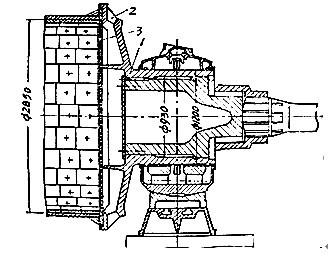 2、圖2是一種中心傳動(dòng)邊緣卸料的裝置。在球磨機(jī)端蓋內(nèi)表面和卸料篦板3之間,形成一個(gè)環(huán)行空間,在端蓋壁上等距切割橢圓形孔2,物料從此孔卸出,落到外罩下部(圖中外罩未畫(huà)出)。